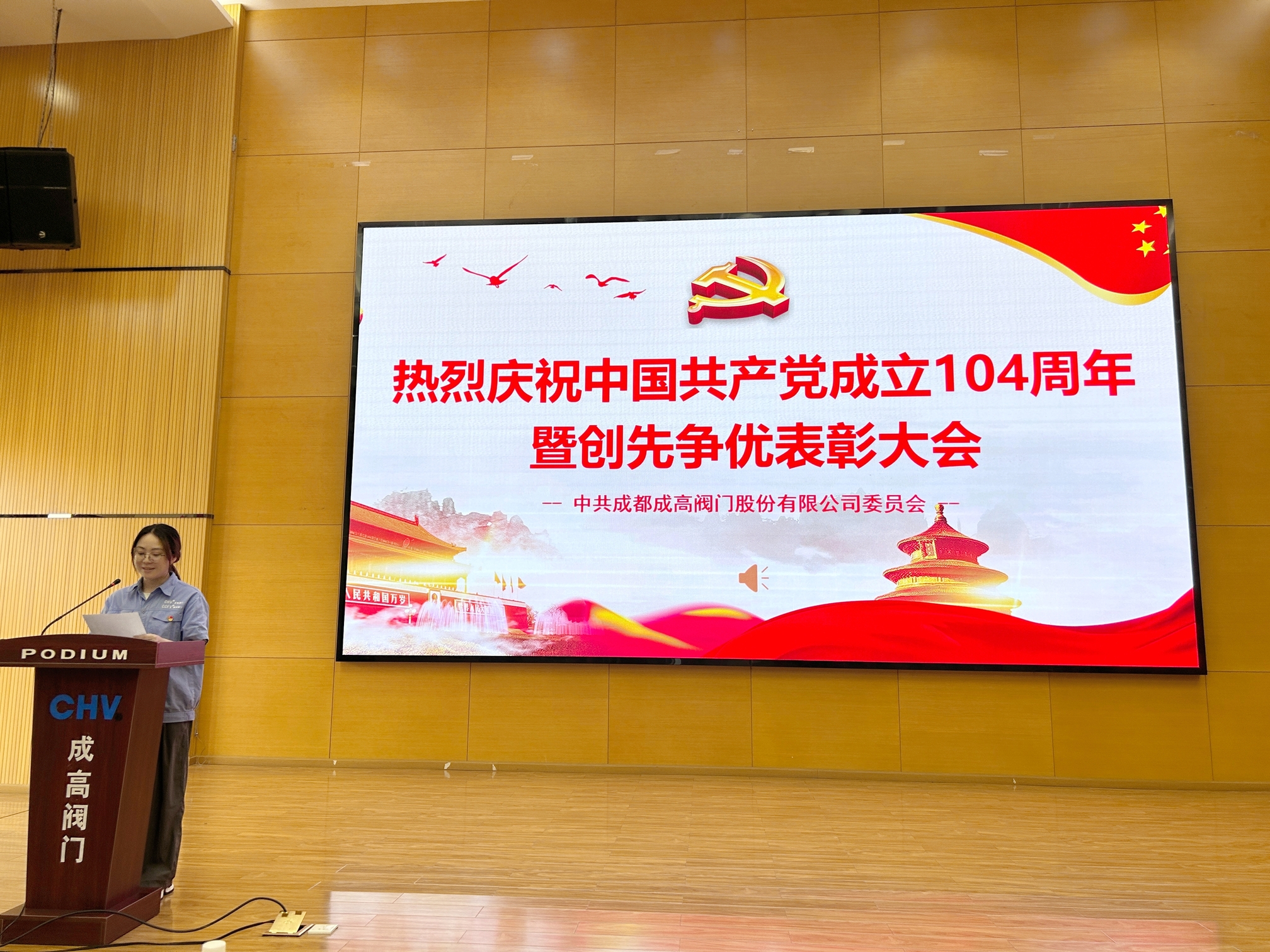 为了迎接中国共产党建党104周年,进一步增强党组织的凝聚力、战斗力,激发公司党员攻坚克难、创优争先的精神,7月1日下午,中共成都成高阀门股份有限公司委员会举行了“热烈庆祝中国共产党成立104周年暨创先争优表彰大会”,公司党委委员兼党办主任孙和兵同志担任大会主持人,公司全体党员、预备党员、发展对象、积极分子、团委干部、青年志愿者队长参加会议。